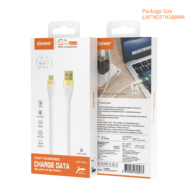 สายชาร์จ d-power  เป็นสายชาร์จและโอนถ่ายข้อมูลคุณภาพสูงจากแบรนด์ d-power ที่เน้นความคุ้มค่าและความทนทาน โดยรุ่นนี้รองรับการจ่ายกระแสไฟสูงสุดที่ 3A ซึ่งจัดอยู่ในกลุ่มชาร์จเร็วสำหรับการใช้งานทั่วไป